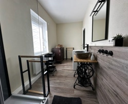 Das stilvolle Duschbad mit einem rustikalen Flusssteinwaschbecken und einer Duschkabine mit Regendusche macht Sie fit für den Tag.
