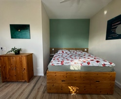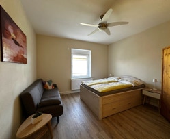 Schlafzimmer 1 bietet ein gemütliches Doppelbett (160 x 200 cm) und ausreichend Stauraum mit Kleiderschrank und Sideboard. Platz für ein Babybett ist ebenfalls vorhanden und wird von uns gern kostenlos zur Verfügung gestellt. Schlafzimmer 2 ist mit einem Doppelbett (140 x 200 cm) und einem Schlafsofa (120 x 190 cm) ausgestattet – ideal für die jüngeren Gäste oder zusätzliche Freunde.