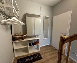 Ein kostenloser Pkw-Parkplatz befindet sich auf dem Grundstück direkt vor der Tür. Ihre Fahrräder können Sie auf dem Grundstück abstellen. Ein Kinderwagen finden in der wettergeschützten und abschließbaren Box vor dem Haus Platz. Bitte beachten Sie, dass die Wohnung ausschließlich über eine Treppe ins Obergeschoss zu erreichen ist.