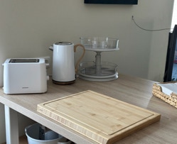 Kochen wird in unserer gut ausgestatteten Küche zum Vergnügen! Genießen Sie modernste Geräte wie Ceranfeld, Backofen, Mikrowelle und Geschirrspüler. Ein reichhaltiges Sortiment an hochwertigen Töpfen, Pfannen und Küchenutensilien lässt keine Wünsche offen. Dazu kommen Kaffeemaschine, Standmixer, Wasserkocher, Toaster und sogar ein Sandwichtoaster – hier kann auch dank einer Grundausstattung an Gewürzen jeder Hobbykoch glücklich werden!
